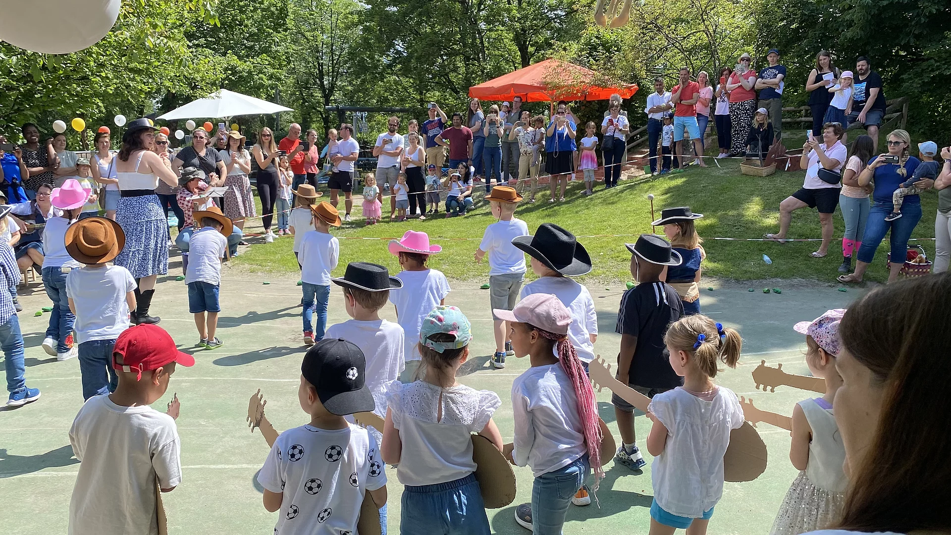 Die städtische Kita „Giraffenhaus“ in Waldram feierte ihr 30-jähriges Bestehen. Kinder, Eltern und Mitarbeitende waren gekommen, um gemeinsam bei einem Picknick sowie Kaffee, Eis und Getränken zu feiern. Kitaleiterin Katja Singer hatte mit ihrem Team das Motto „Wilder Westen“ ausgegeben: Es gab eine kleine Westernstadt und eine Schatzsuche. Zur Feier des Tages hatten die Kinder einen Linedance einstudiert.