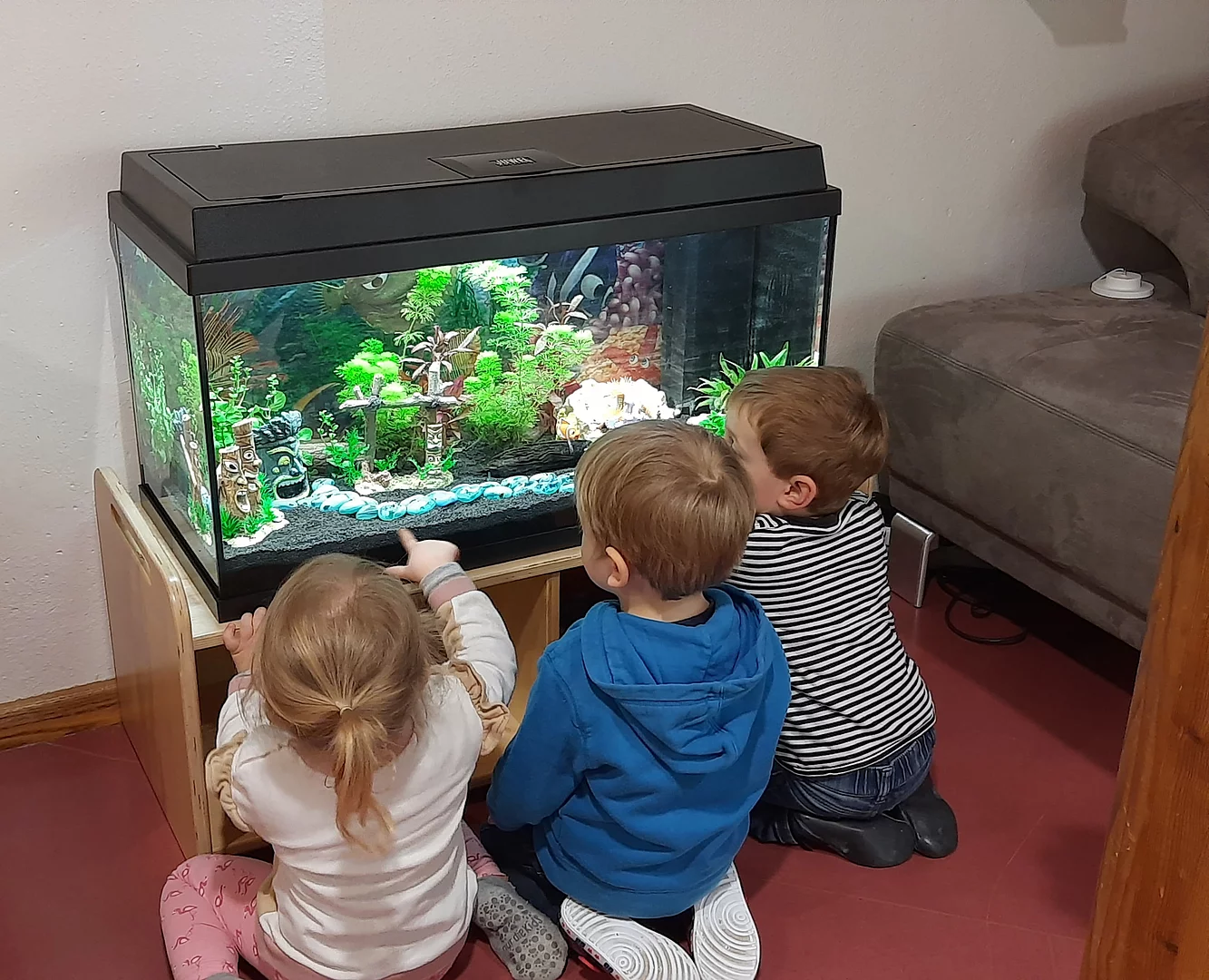 Doch bevor es an seinem Platz kann, musste das Alte umziehen. Es wurde bisschen Wasser ausgelassen und vorübergehend in ein anderes Zimmer gestellt. Nachdem das alte Aquarium mit samt den Bewohnern umgezogen war, halfen die Krippenkinder beim Befüllen des neuen Zuhauses. Sie schütteten fleißig schwarzen Kies auf den Aquarien Boden und verteilten die neue Deko und Wasserpflanzen.